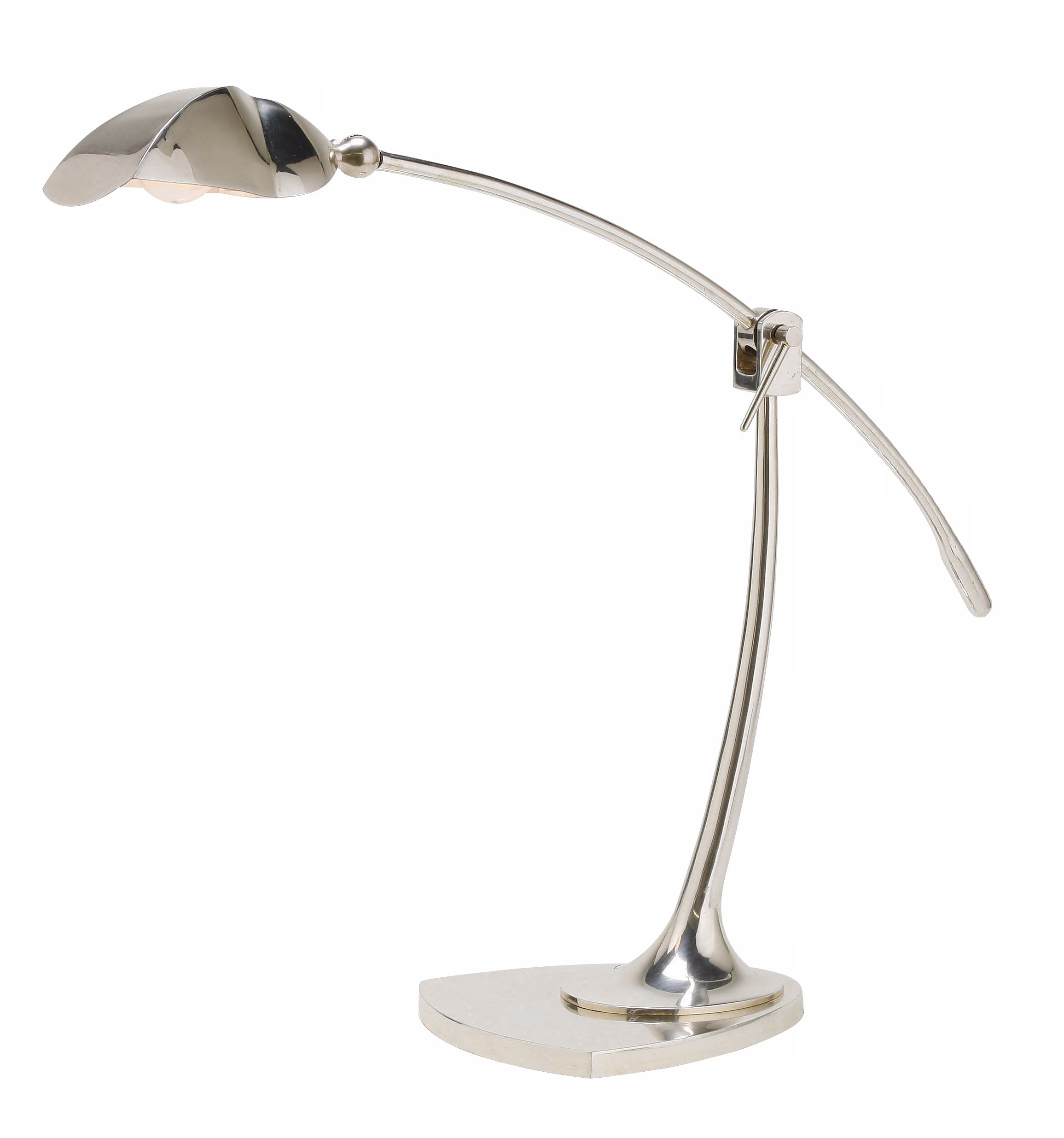 So sleek, this lamp will work with all decor styles. In a cool antique silver finish, the sweeping arm is adjustable. For office or home, the lamp features a sculpted metal shade which directs the light just where you want it. The scene stealers are the formed base and the artistic, ageless shade. Original design by Arteriors Home. Antique Silver finish. Hardback silver finish shade. In-line on-off switch. By Arteriors Home desk lamps. Takes one 40 watt bulb (not included). Adjustable to 24" high. 27" wide arm. 8" wide base